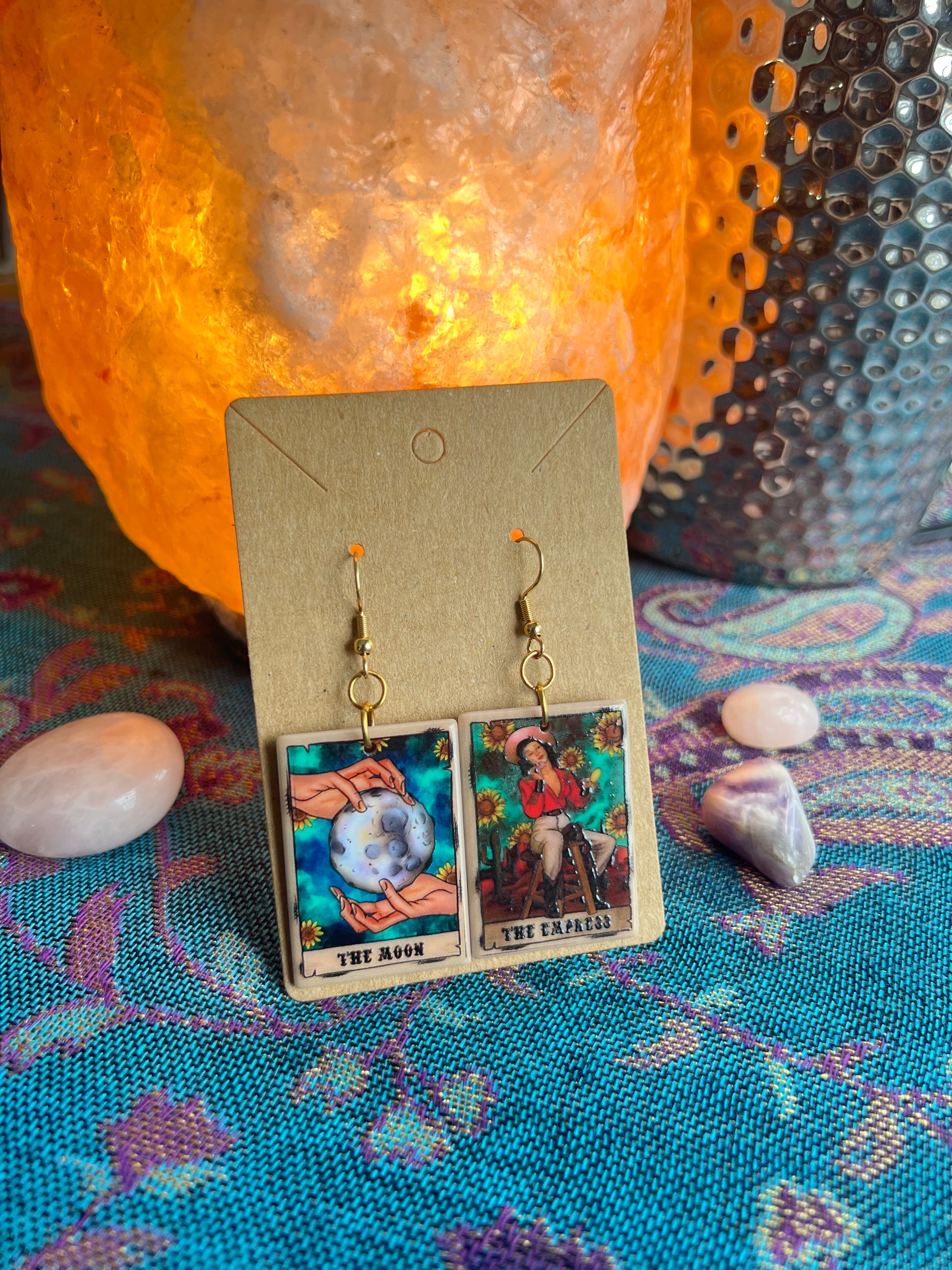 Si te apasiona lo esotérico, estos aretes de cartas del Tarot son perfectos para ti. Hechos a mano, representan el mundo y la emperatriz, para llevar contigo la fuerza y sabiduría de estas figuras en cada momento. ¡Añade un toque mágico a tu estilo con estos aretes!
