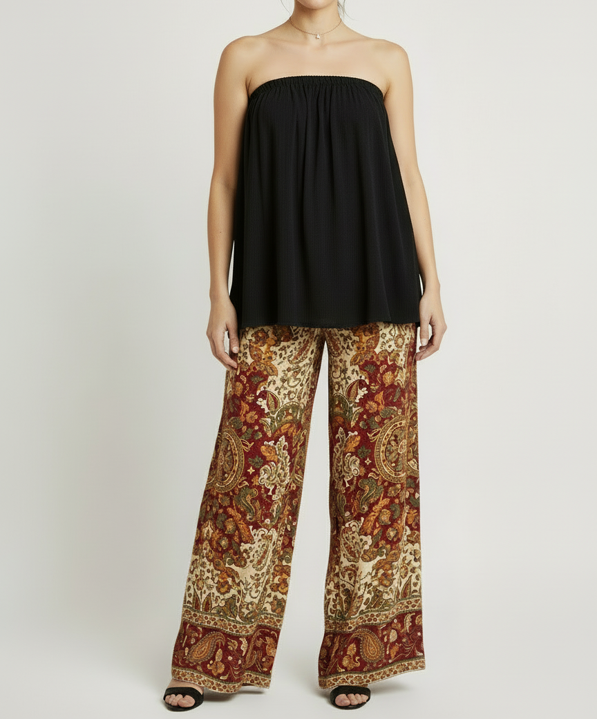¡Esta blusa Yuri Top es perfecta para tus atuendos bohemios! Es una hermosa blusa negra de tela de rayón crinkle, con un diseño strapless, que te permitirá usarla con lo que quieras gracias a su talla única. ¡Hazte con ella y dale un toque de estilo a tus outfits!
