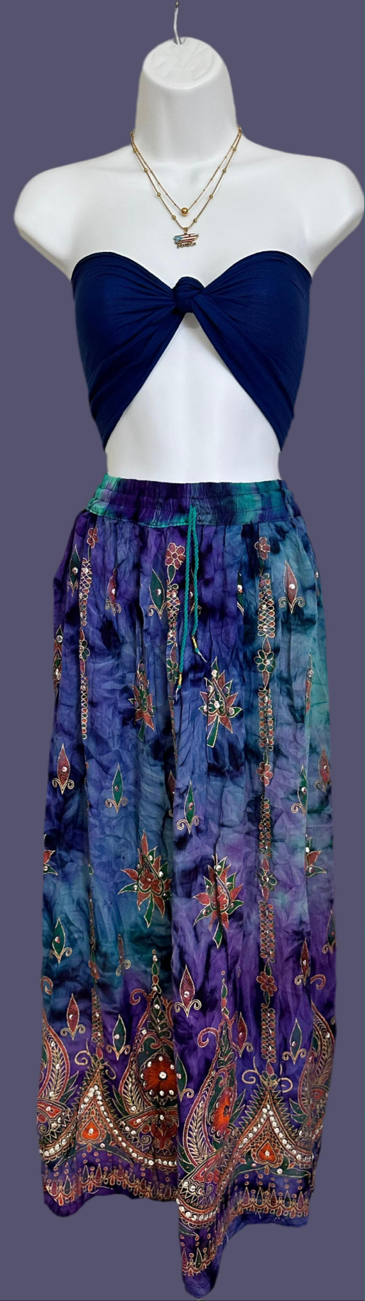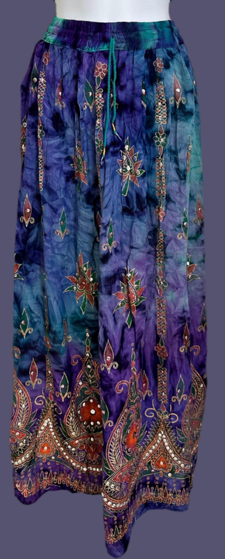 La falda India (O/S) es perfecta para añadir un toque bohemio y colorido a tu atuendo. Con su patrón tie-dye en tonos púrpura y turquesa, te destacarás en cualquier ocasión. Además, su talla única la hace versátil y cómoda de usar.