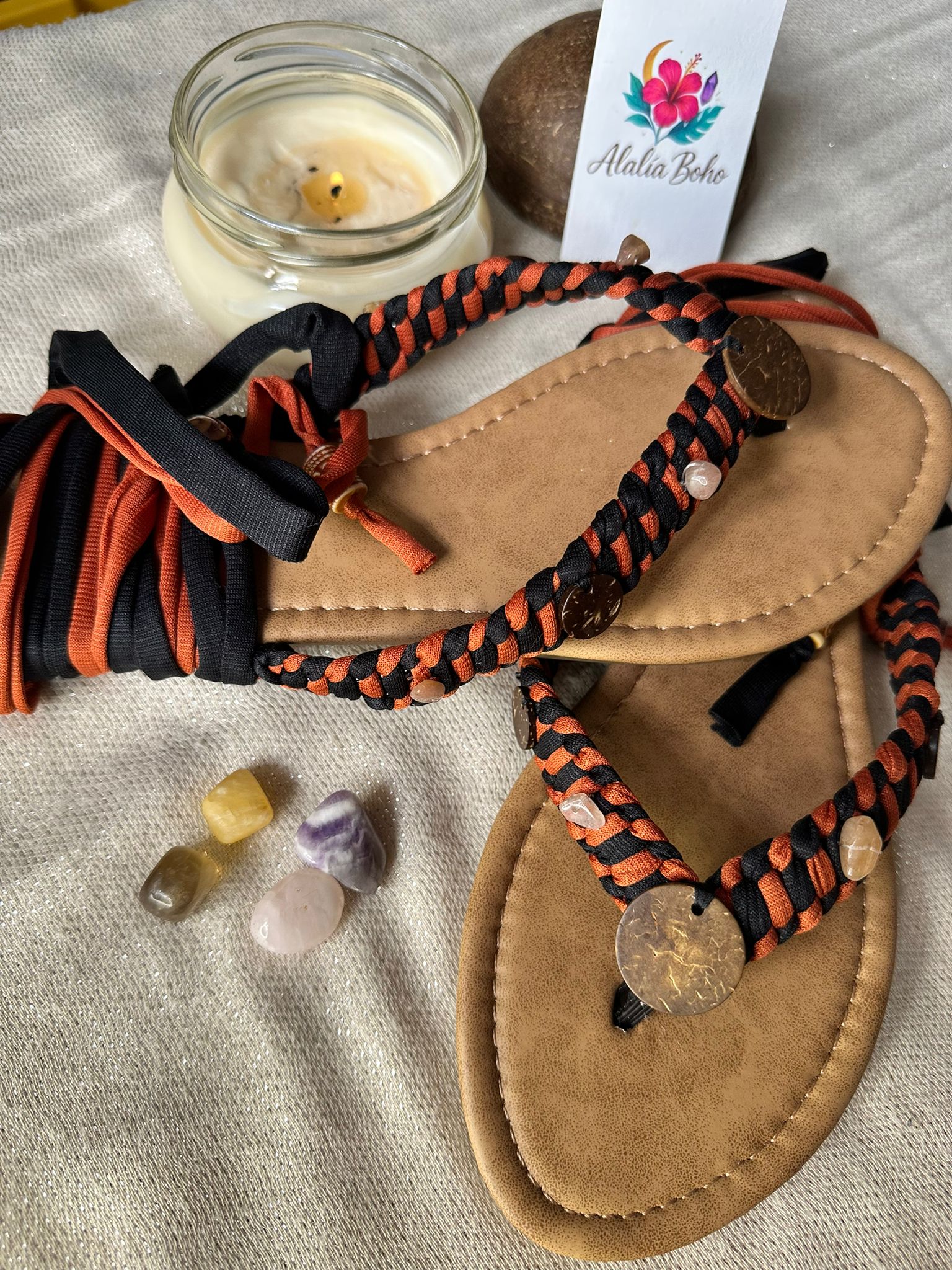 Disfruta de la versátil elegancia de las Sandalias Únicas, éstas son personalizadas al estilo de Alalía Boho. Trenzadas a mano en color negro y terracota y combinadas con detalles en madera y piedras, estas bellas sandalias están diseñadas para tu estilo boho-chic único. Busca tu estilo, con nuestras piezas de nuestra boutique y crea looks únicos. Talla 8. ¡Ponte en contacto con tu lado más creativo y diviértete con estas bellas sandalias!