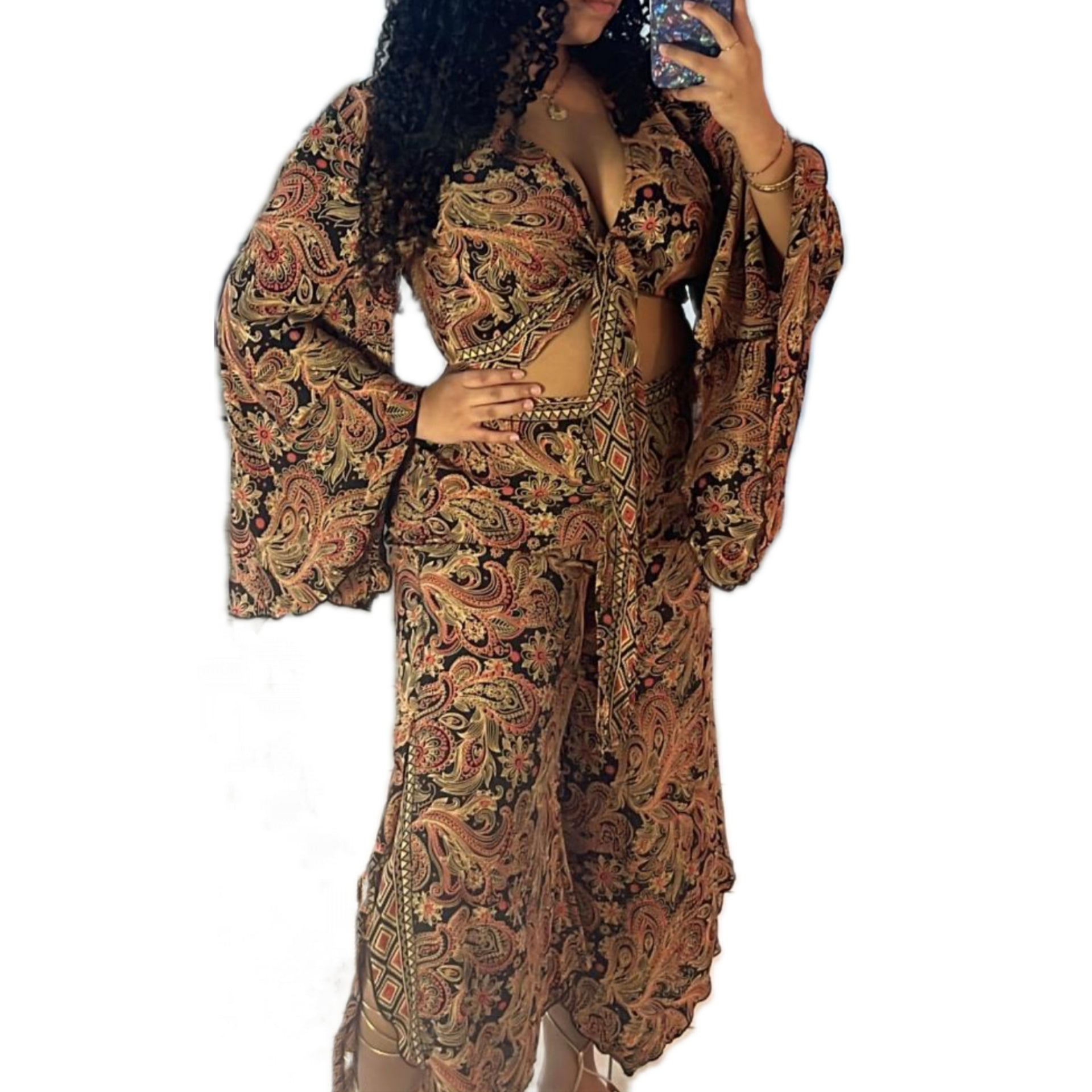 Este Set estilo 70th atemporal es perfecto para una cualquier ocasión. Su diseño de los 70th ofrece un estilo único tipo pasley y su elástico trasero del garantiza comodidad. A pesar de tener un pequeño defecto en el patrón, su precio más económico lo hace una opción práctica y versátil. Talla única.